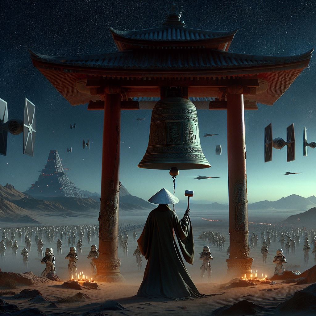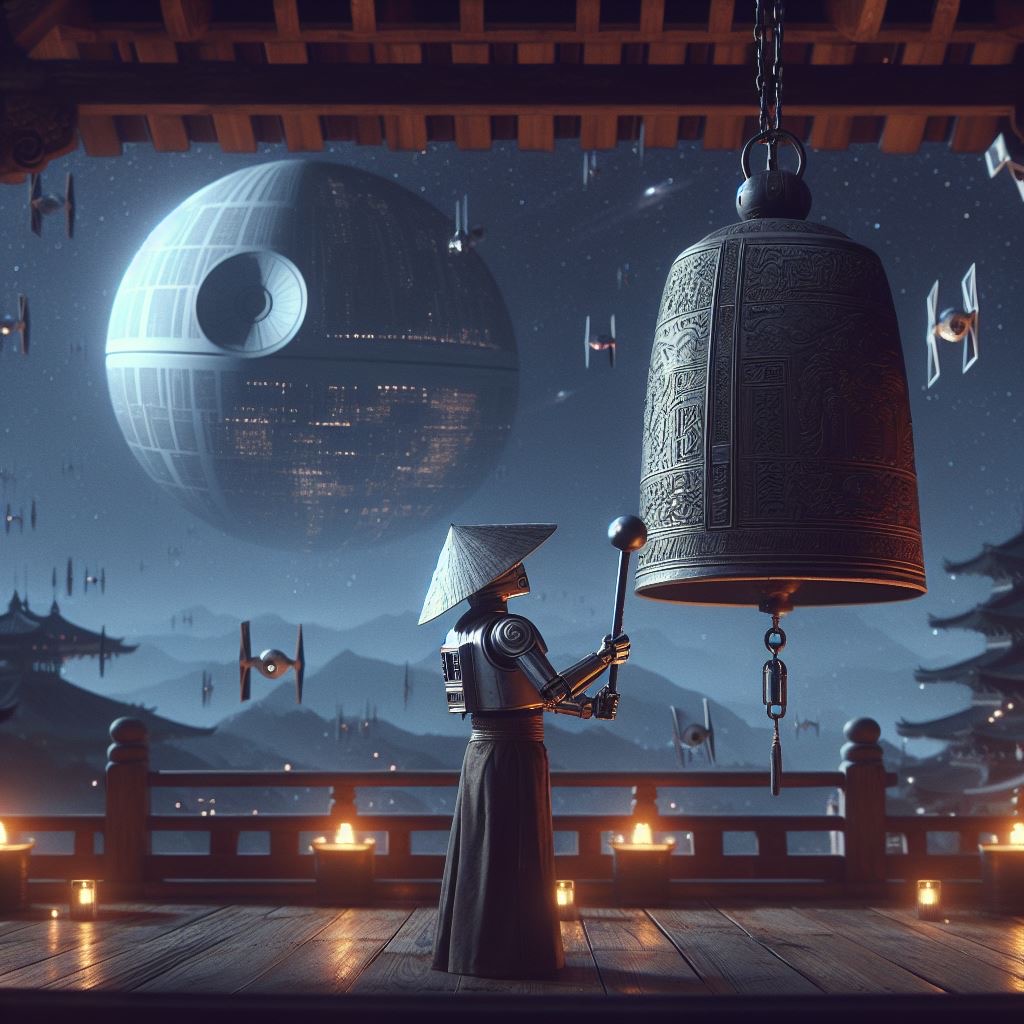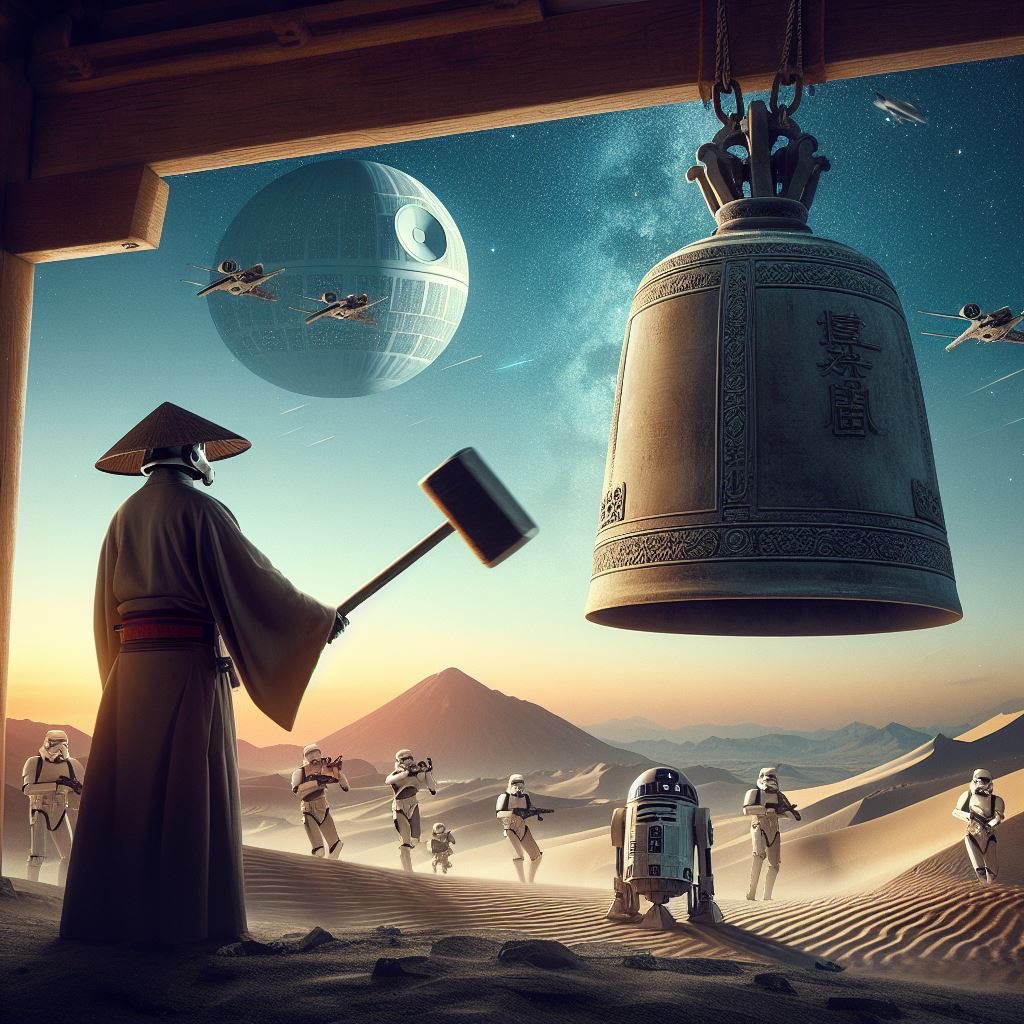 遠い昔はるか彼方の銀河系で、星の光が宇宙を照らし、41OTO-COたちが各地の除夜の鐘の前に佇んでいた。彼らの手には、力強い鋼のハンマーが握られている。静寂が広がっていた。