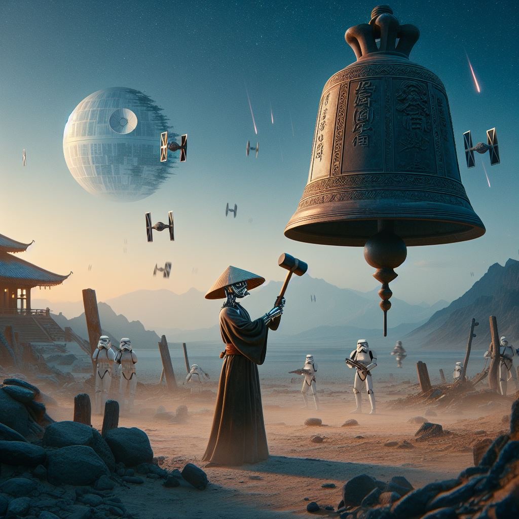その瞬間、41OTO-COたちの心が躍動し、鋼のハンマーが鐘に向かって一斉にぶつかった。音はまるで宇宙が一つになる瞬間のように響き渡り、41OTO-COたちドロイドの体がその振動に合わせて輝き、まるで宇宙全体が鋼の調べに包まれているかのようだった。