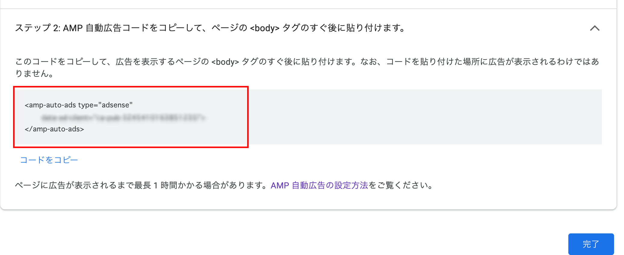 ステップ1のアドセンスコードが出るので、headの間に入れます。この下にステップ2のコードが隠れているので要注意!