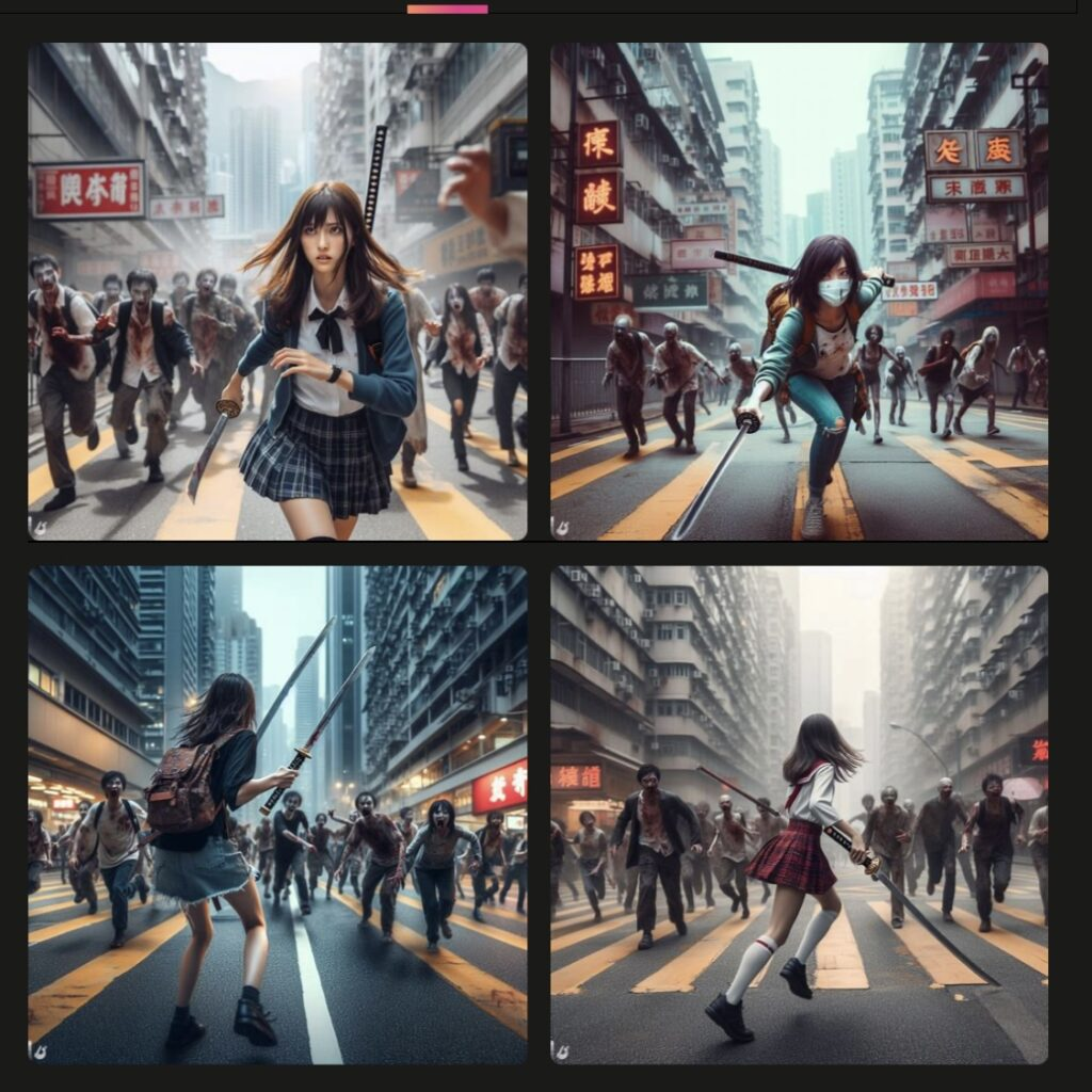 香港の市街地。日本刀を振り回している女の子が、ゾンビから逃げているアメリカンコミック。