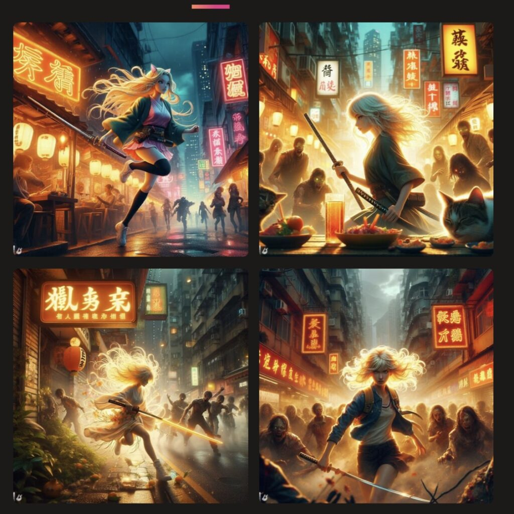 自然光。香港の市街地の屋台街。日本刀を振り回しているブロンドのアメリカ人の女の子が、ゾンビアーミー軍団から逃げているアメリカンコミックの実写映画。日本刀が光を放っている。髪がなびいている。ネオンの看板が美しい。ネコが寝ている。