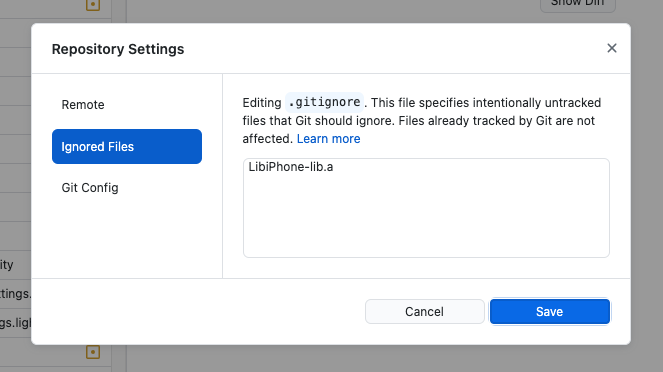 Ignored Files欄に「LibiPhone-lib.a」を記入して無視してもらう事にしました。