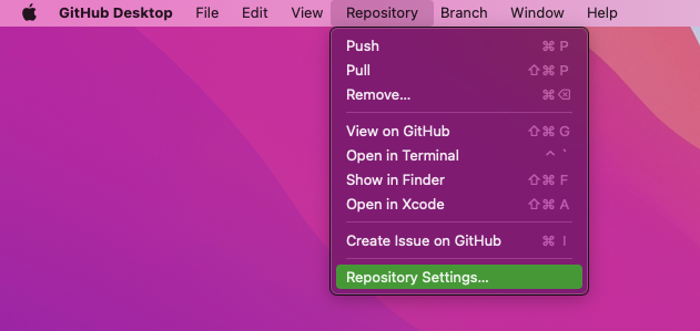 なのでGitHub DesktopのメニューからRepository Settingsを開きまして。