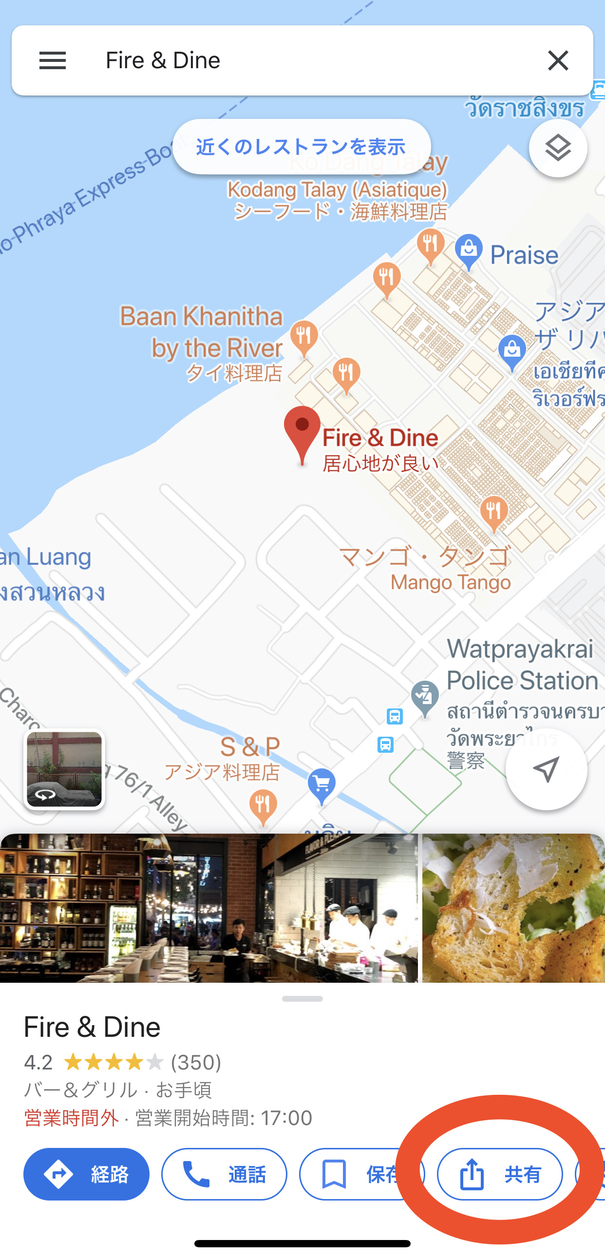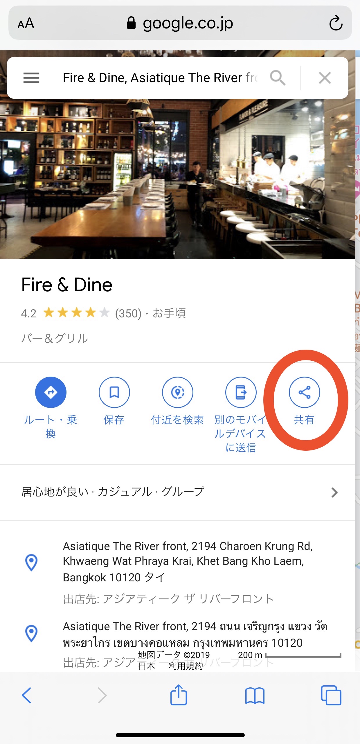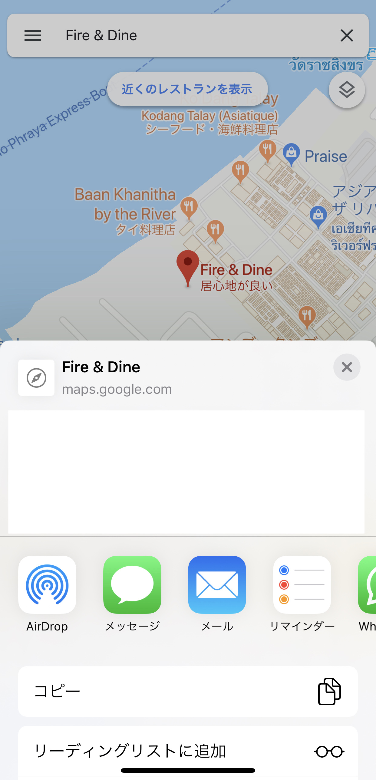 ダメな例。iPhoneのGoogleマップアプリで「Fire & Dine」さんを検索して共有ボタンを押します。