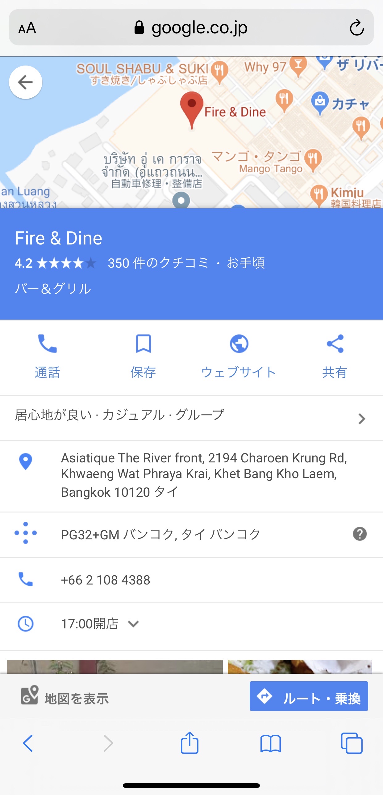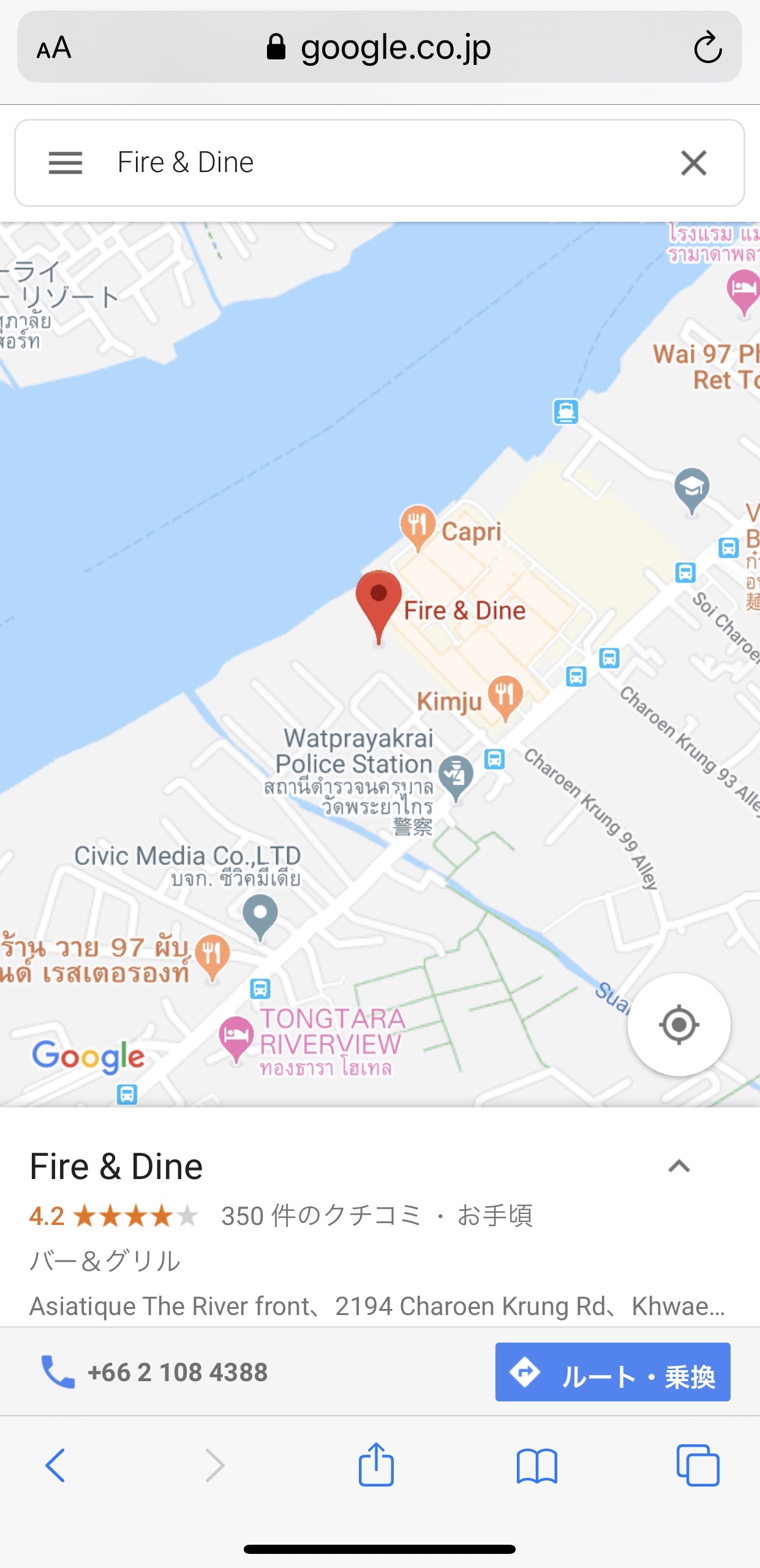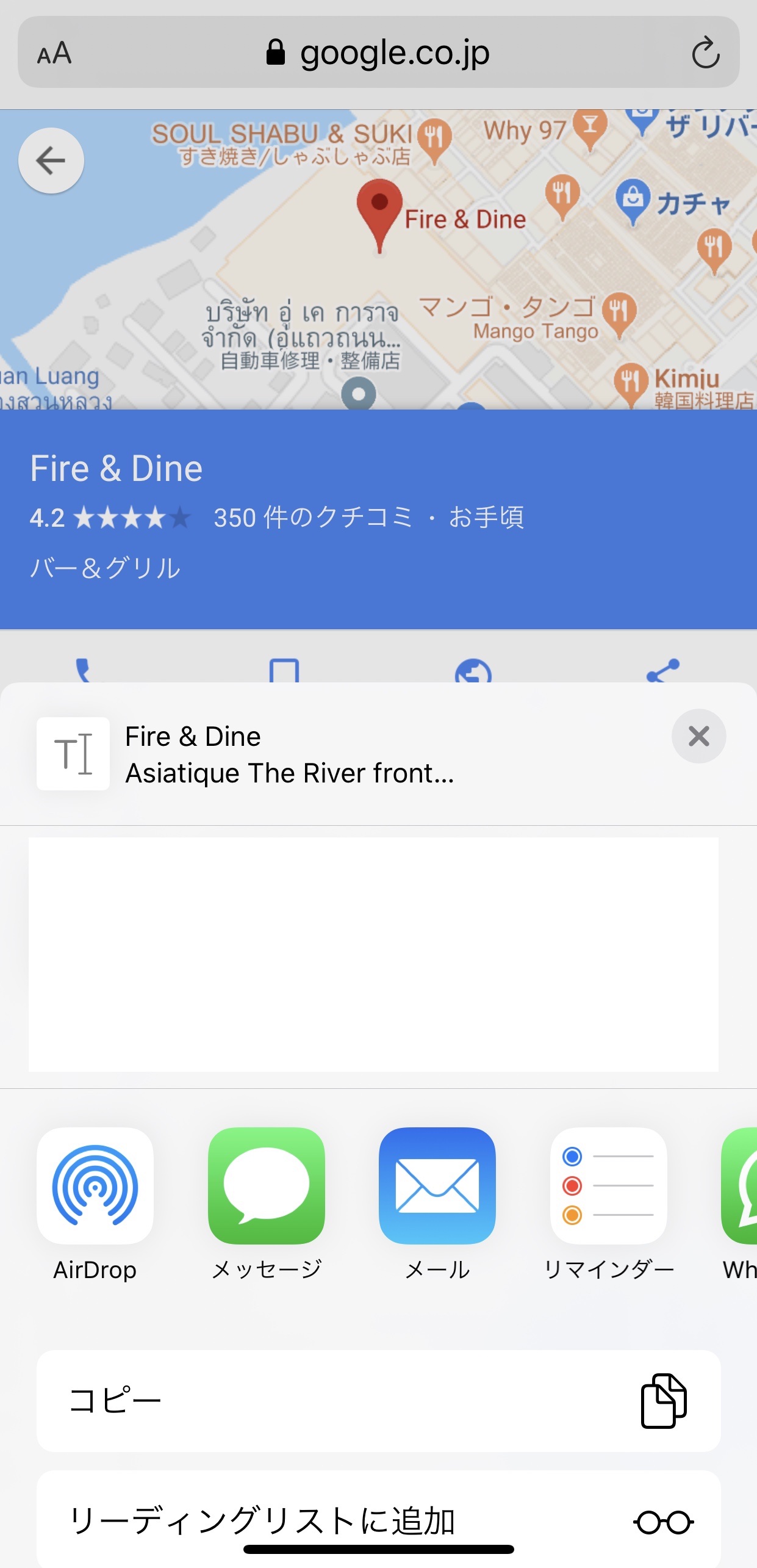 ダメな例。iPhoneのGoogleマップアプリで「Fire & Dine」さんを検索して共有ボタンを押します。