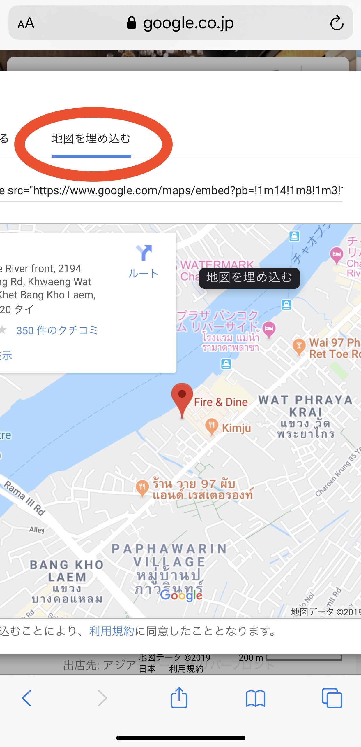 ここではバンコクのグリルドチキン屋さん「Fire & Dine」を例に、HTMLコードを埋め込んで、ブログに地図を貼る方法を記します。