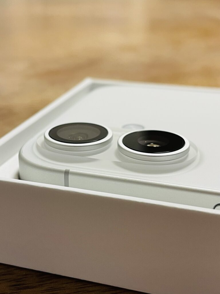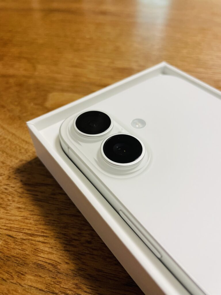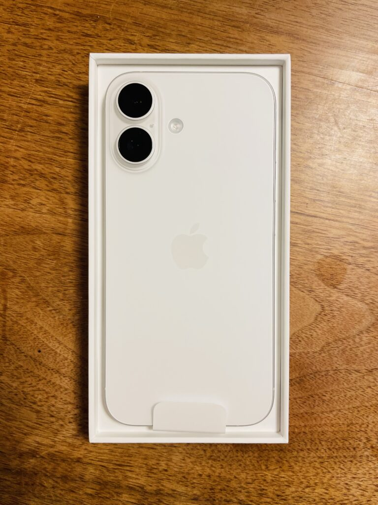 箱を開けると、まず目に飛び込んでくるのがiPhone16本体。私が購入したのはホワイトモデル。このホワイトは、一目で清潔感と高級感を感じさせ、どんな場面でも洗練された印象を与えてくれます。角度によって変わる光の反射は、まるで一枚のアートのようで、毎回手に取るたびにその美しさを再確認できるでしょう。