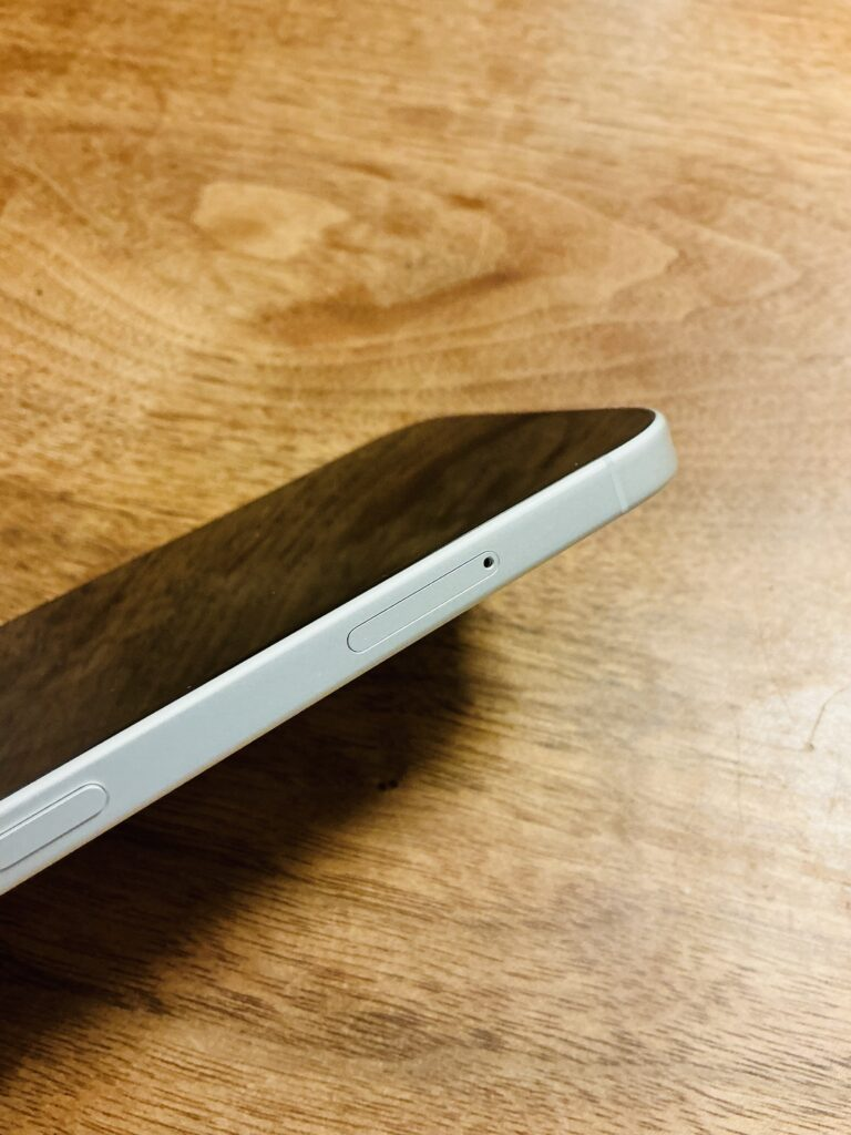 iPhone16の側面にあるSIMトレイの小さな穴に、SIMピンを挿し込みます。軽く押し込むと、SIMトレイがポップアップして出てきます。