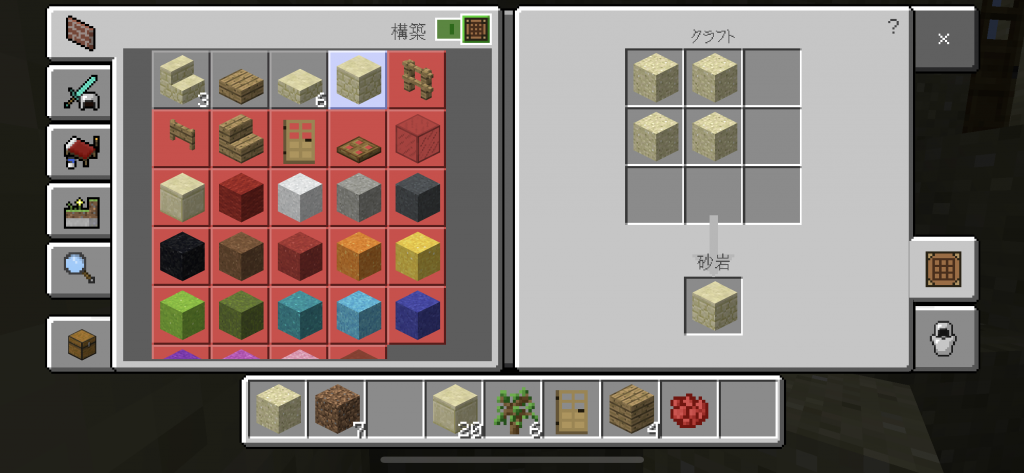 画面右側に注目。砂を四個集めて砂岩を一個作る。何て地味な作業や。でも、こんな地味な作業好きよ。