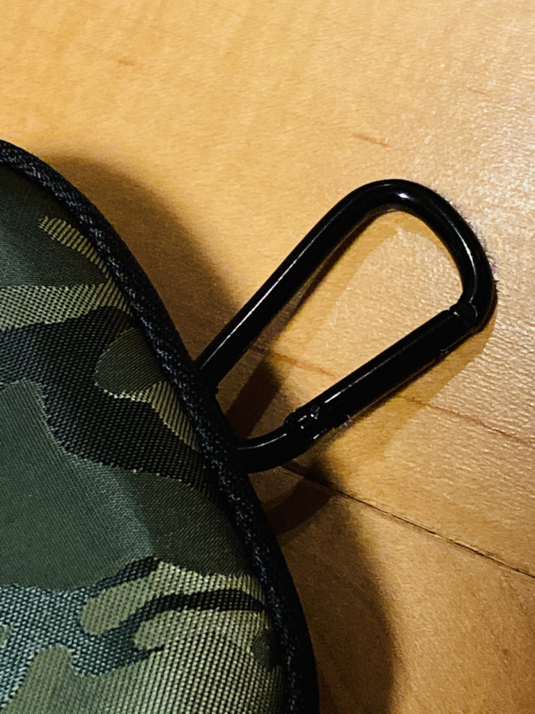 なんとカラビナ付きです。アウトドアグッズみたいに、このままバックパックにぶら下げる事が出来ます。ぶら下げる事があるか疑問ですが。