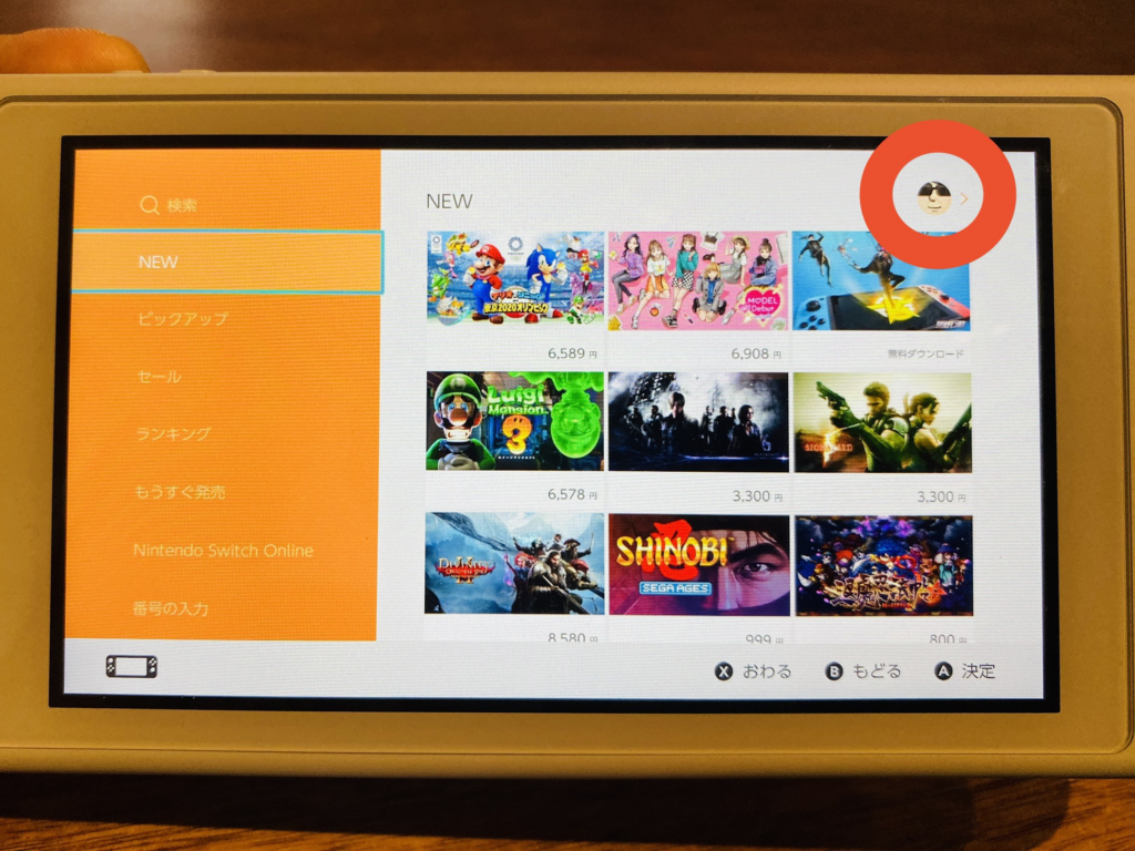 「ニンテンドーeショップ」を開いて右上のニンテンドーアカウントと連携しているユーザーアイコンをタッチして下さい。