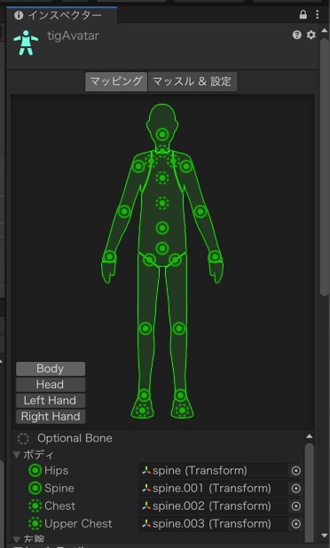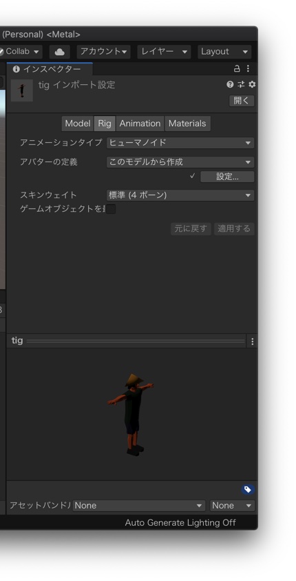 最後にUnityでそのFBXを読み込み、インスペクターでRigの設定をします。