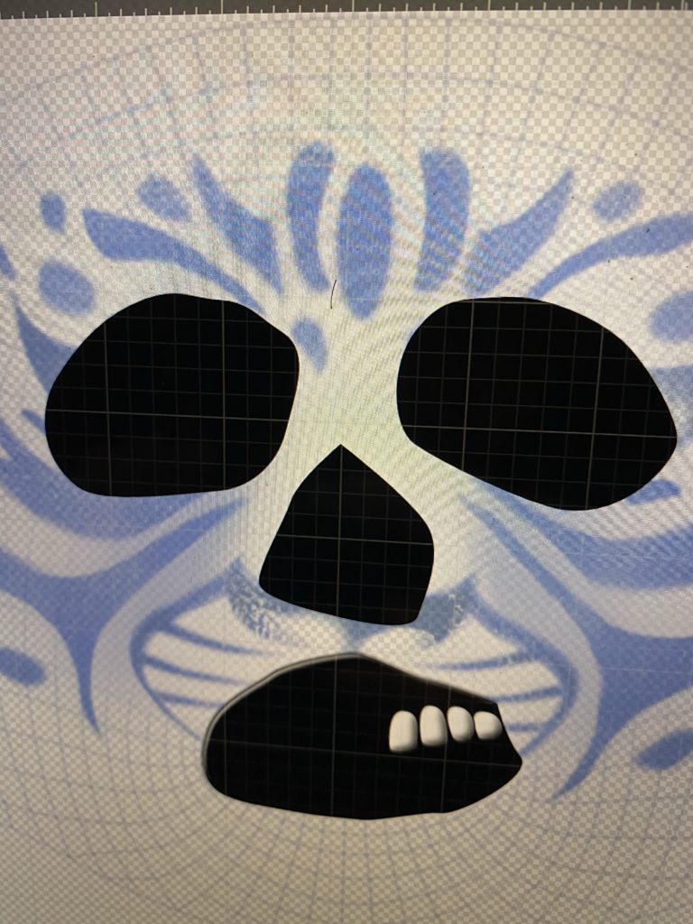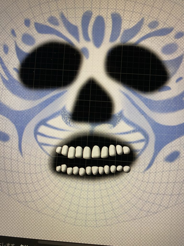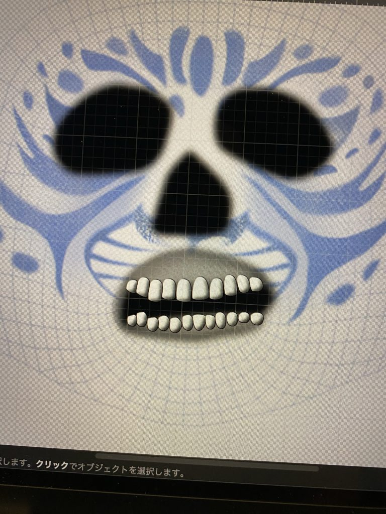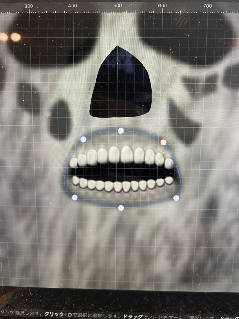 メッシュの下絵に、目と鼻と口の位置の当たりをつけ、歯から入れていきます。